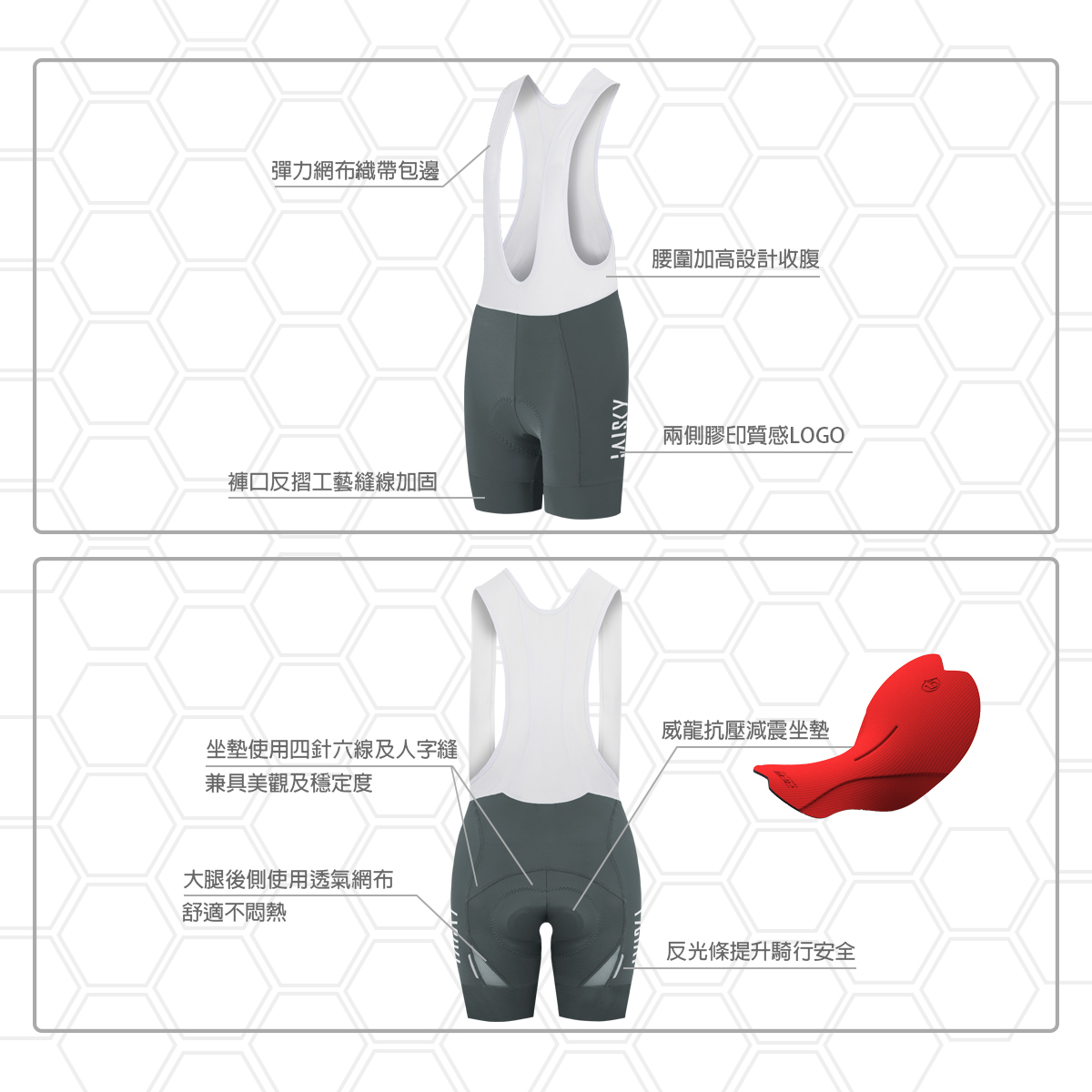 ● 臀後方透氣布料及反光條設計,舒適不悶熱