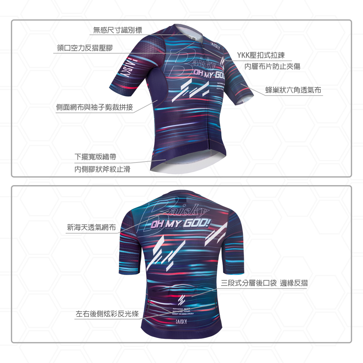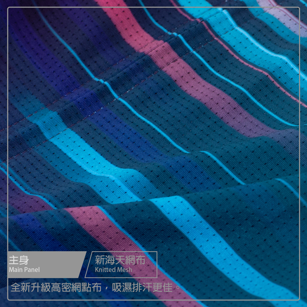 ● 袖子使用六角蜂巢梭織布,空力一體成型設計,側邊網布與袖子合身拼接