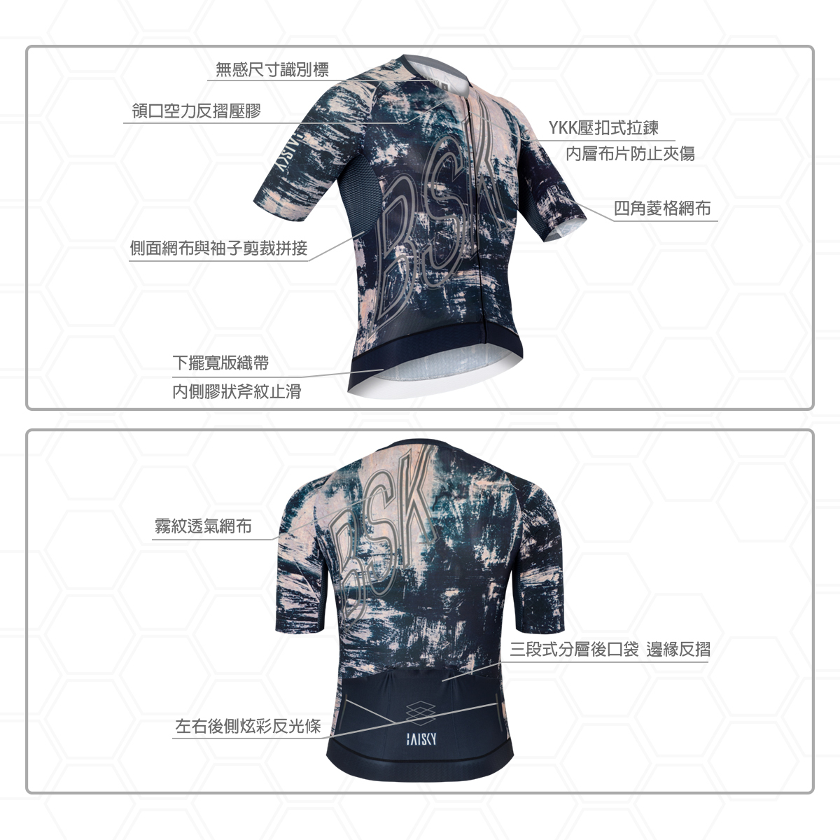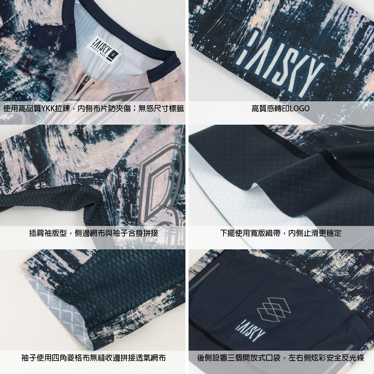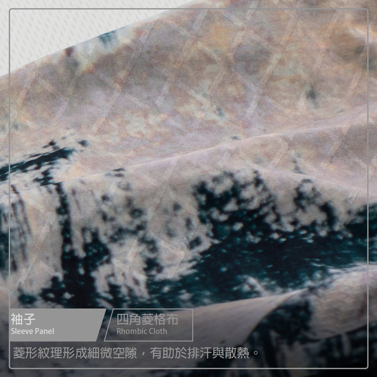 ● 袖子使用四角菱格布無縫收邊拼接透氣網布