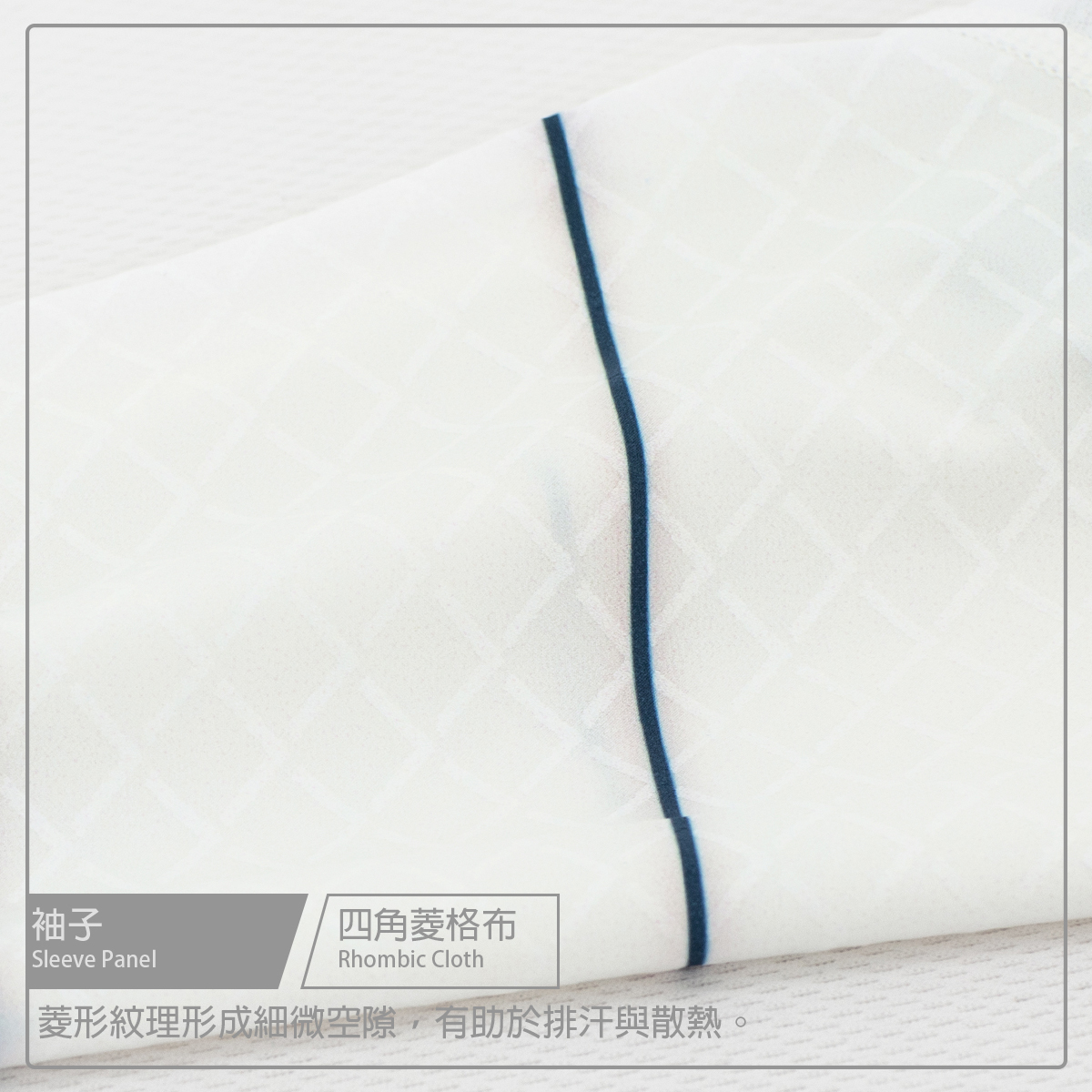 ● 袖子使用四角菱格布無縫收邊拼接透氣網布
