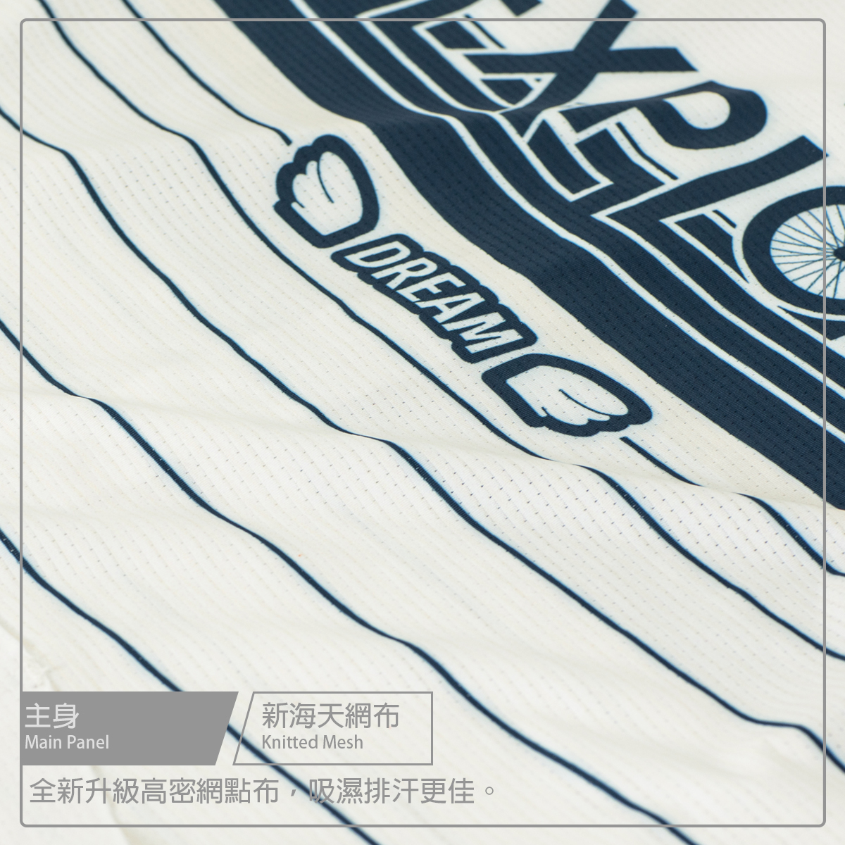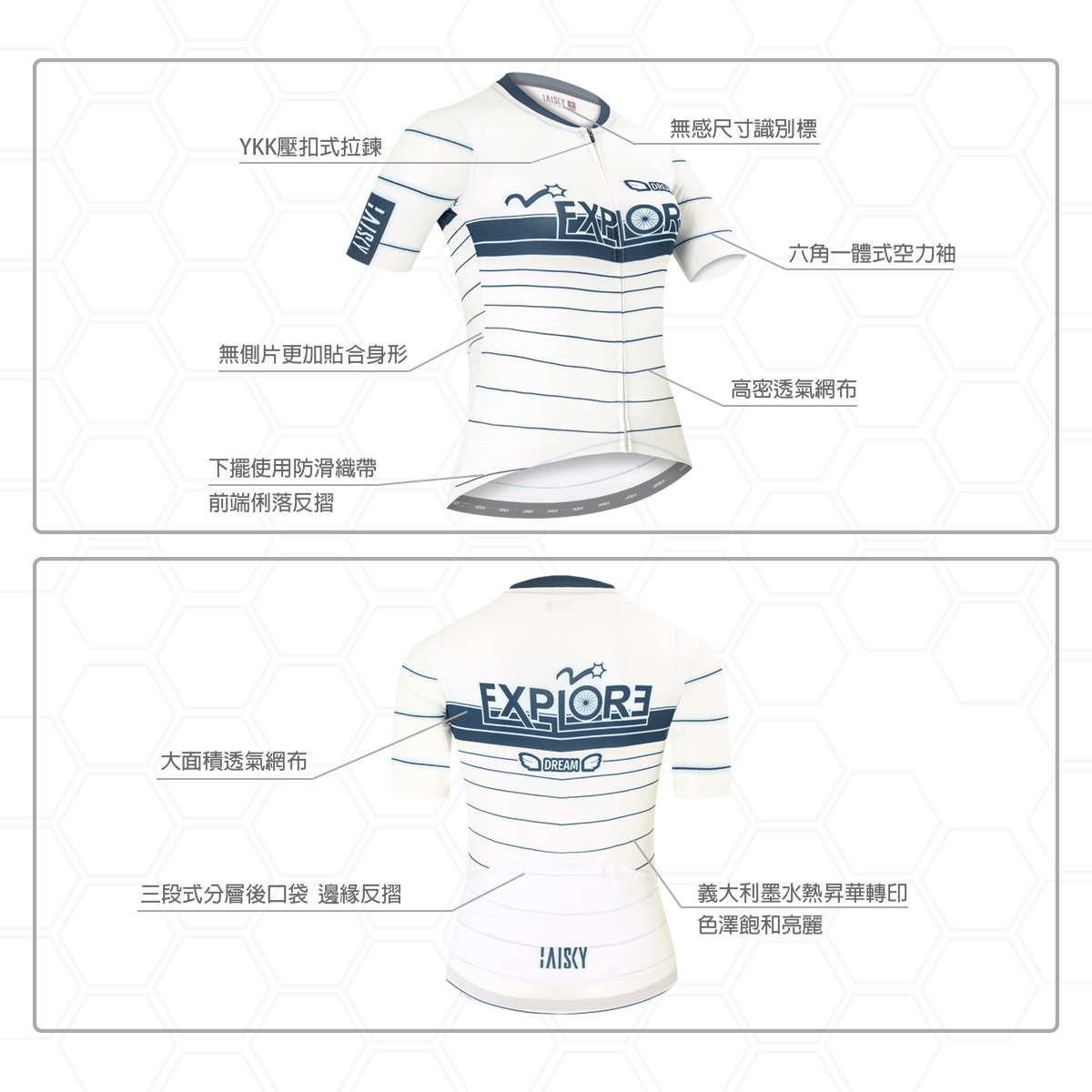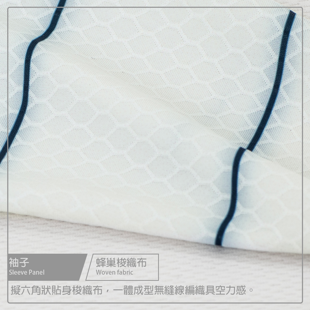 ● 袖子使用六角蜂巢梭織布,空力一體成型設計