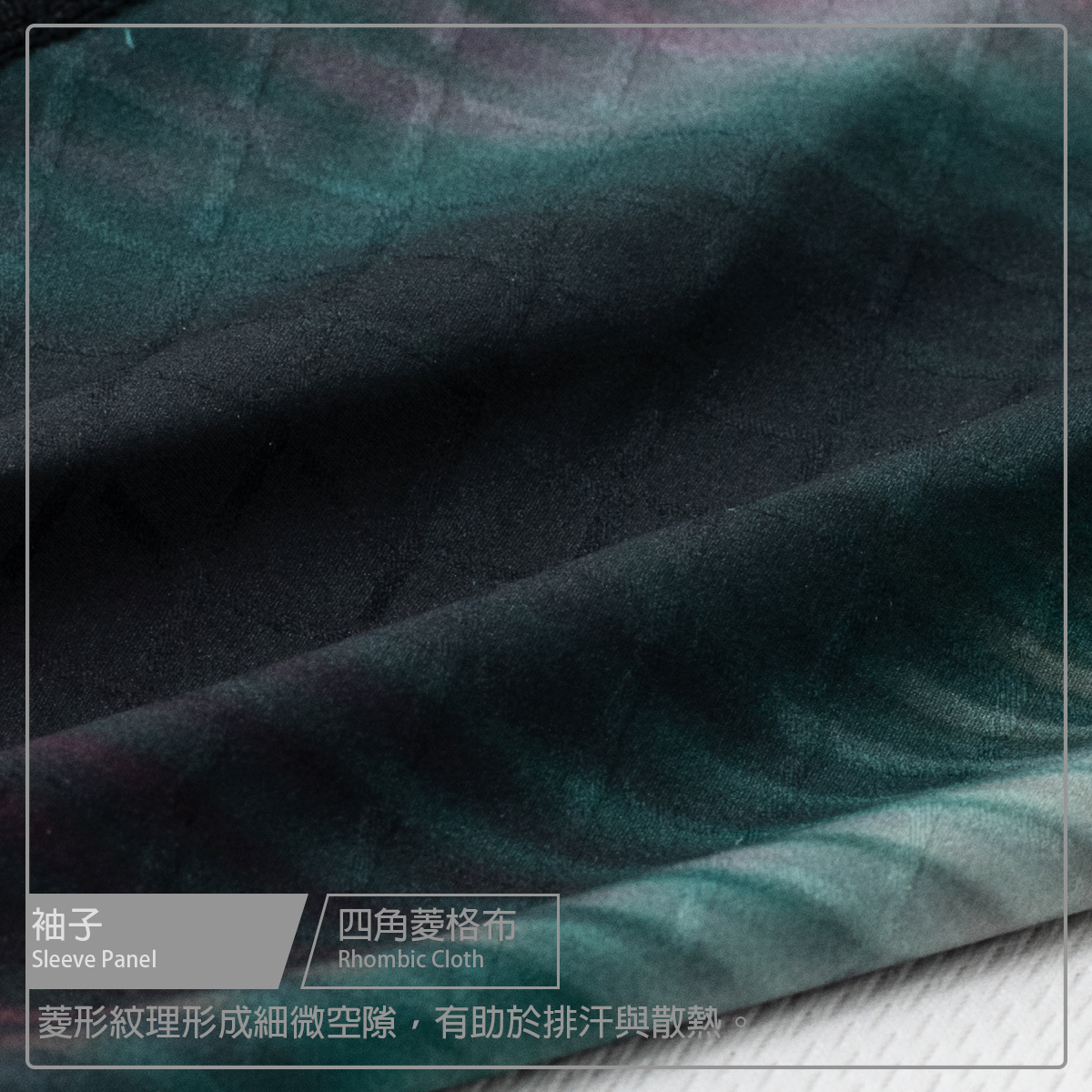 ● 袖子使用四角菱格布無縫收邊拼接透氣網布