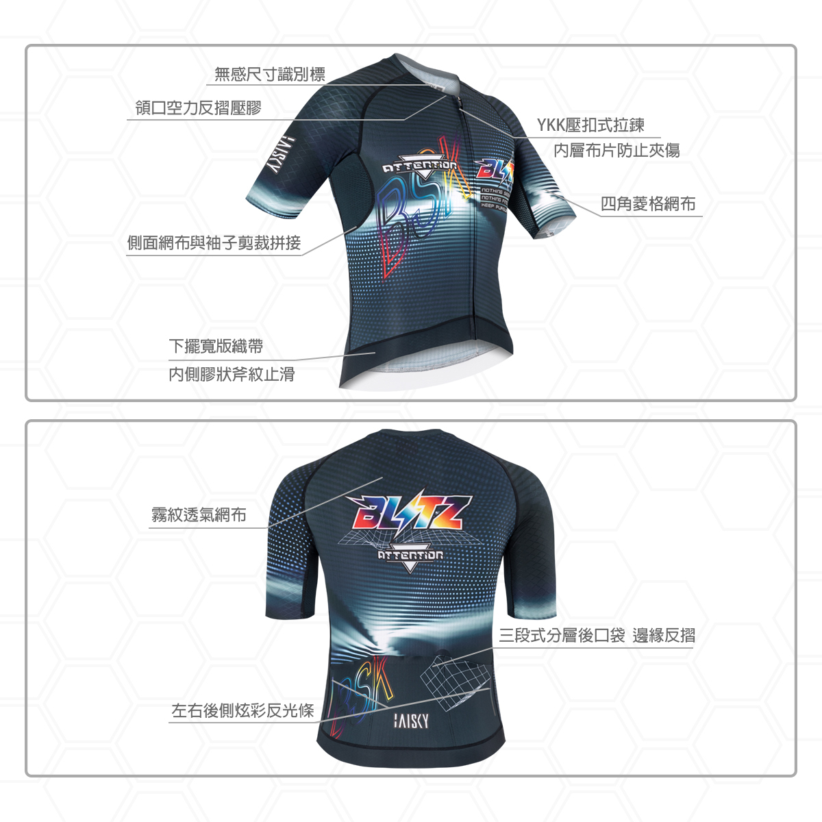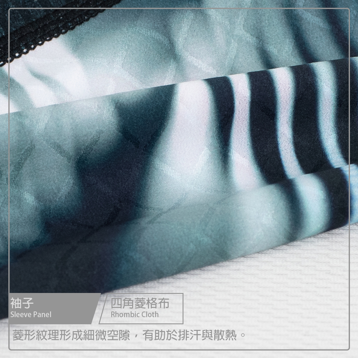 ● 袖子使用四角菱格布無縫收邊拼接透氣網布