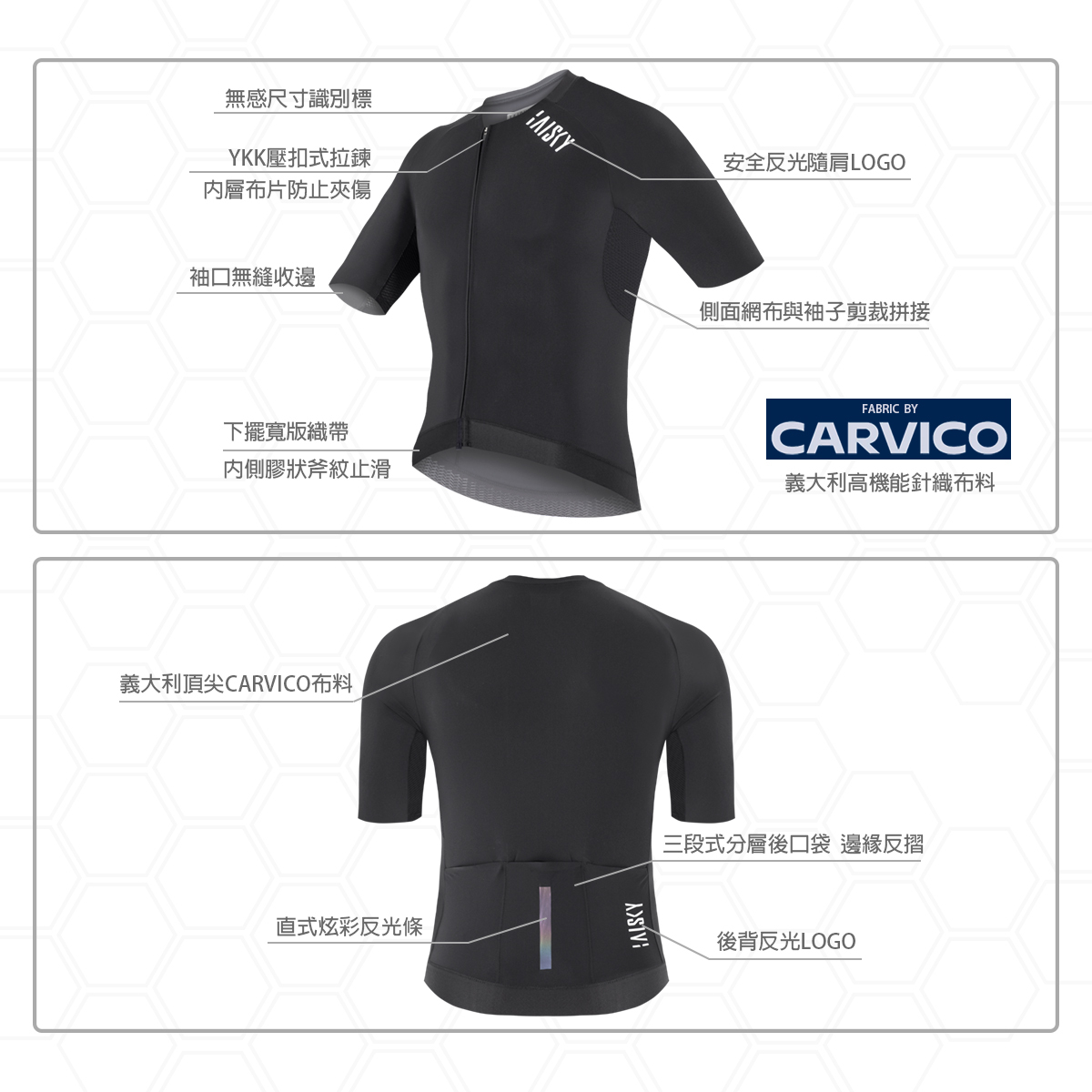 ● 袖子使用無縫收邊技術拼接透氣網布