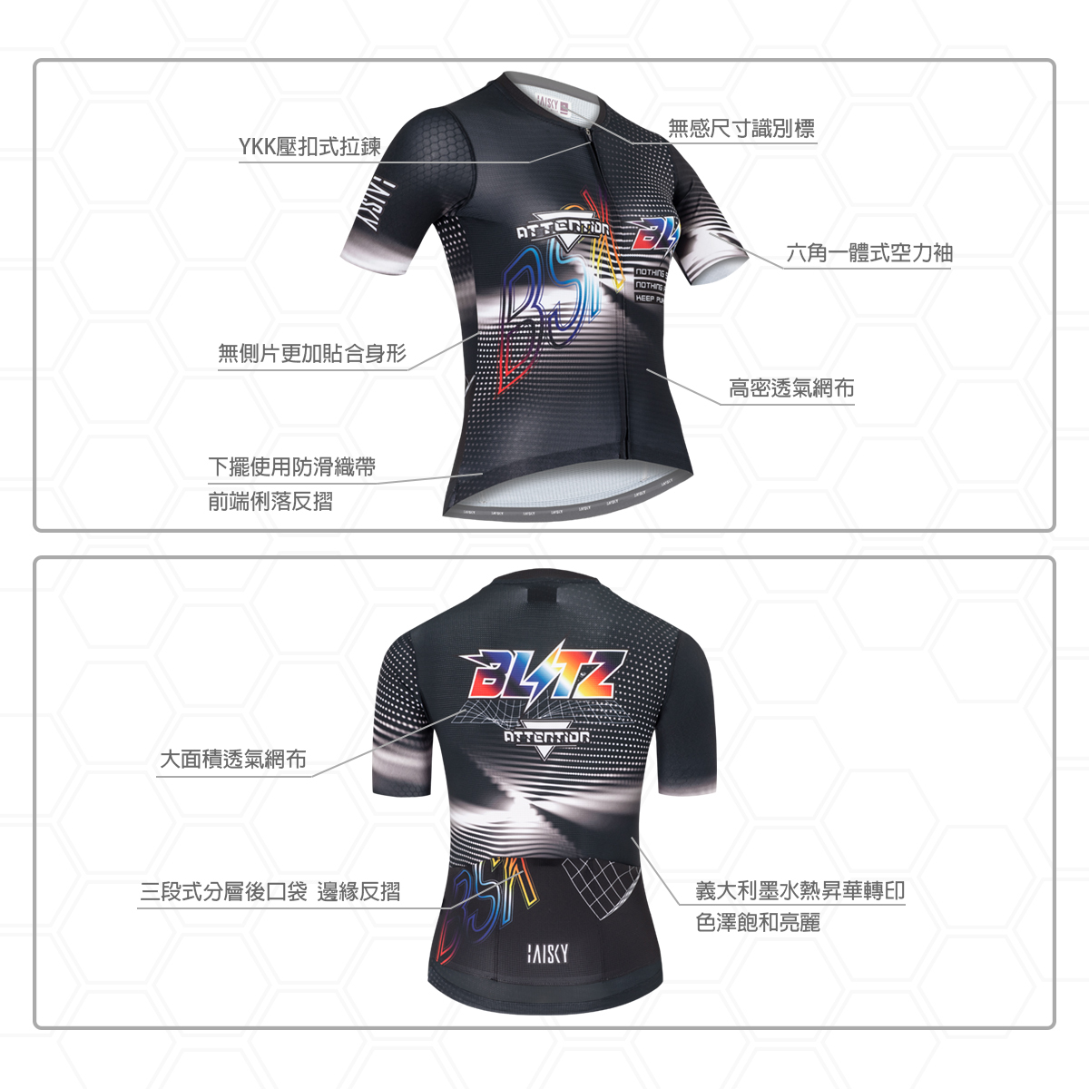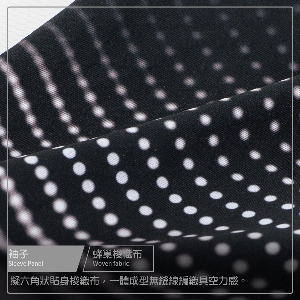 ● 袖子使用六角蜂巢梭織布,空力一體成型設計