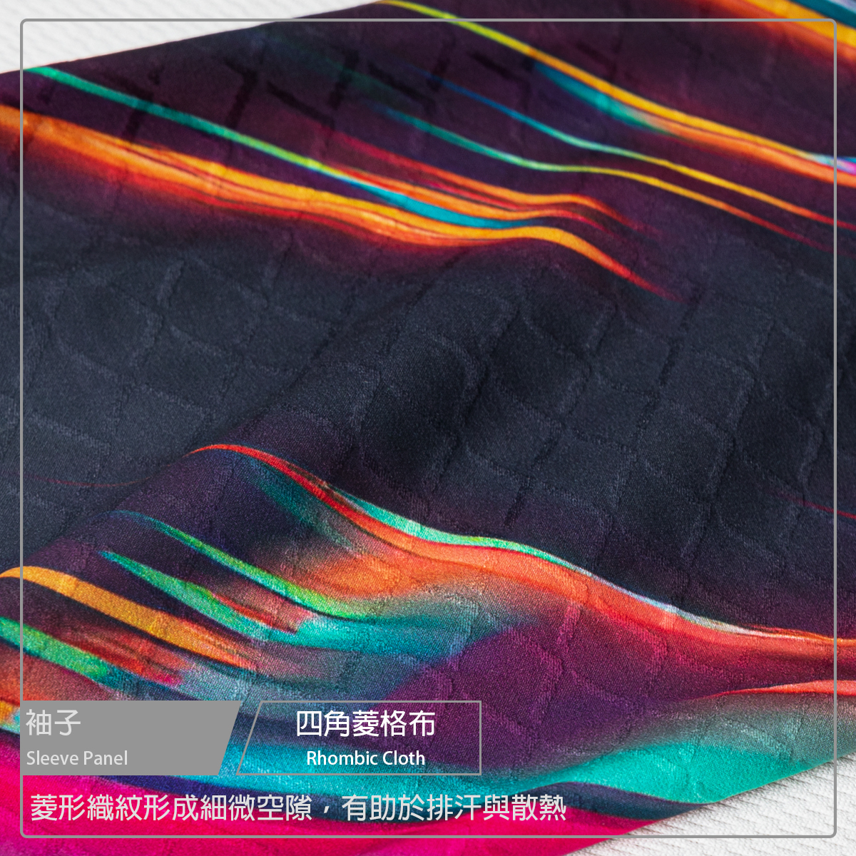 ● 袖子採用菱形網布極密透氣織紋,袖口無縫收邊完美貼合