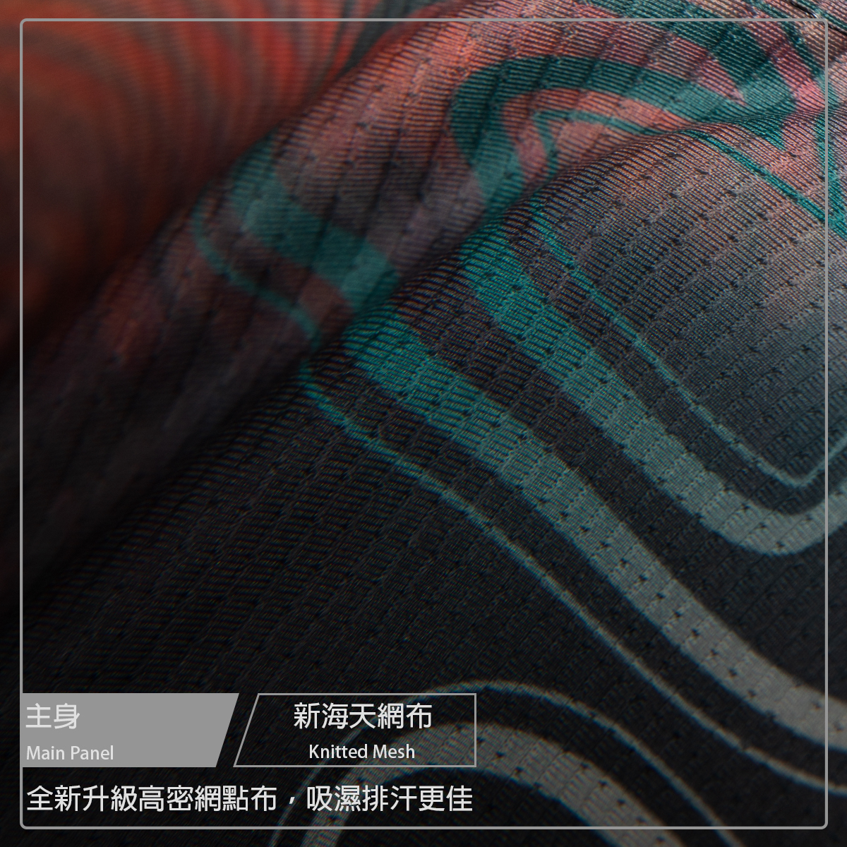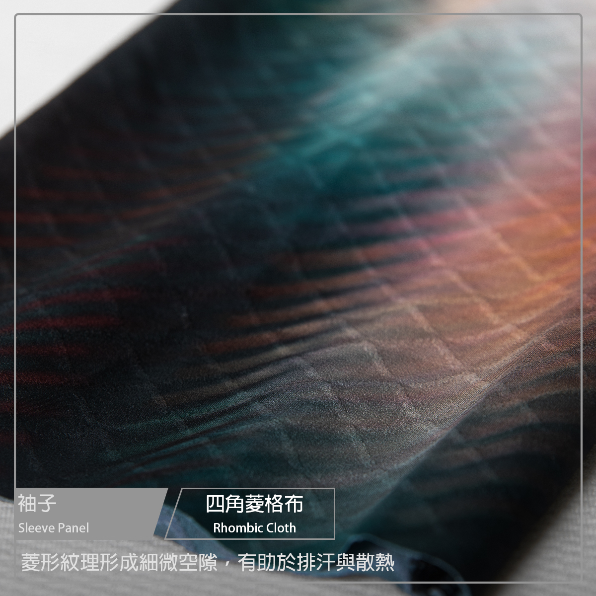 ● 袖子採用菱形網布極密透氣織紋,袖口無縫收邊完美貼合