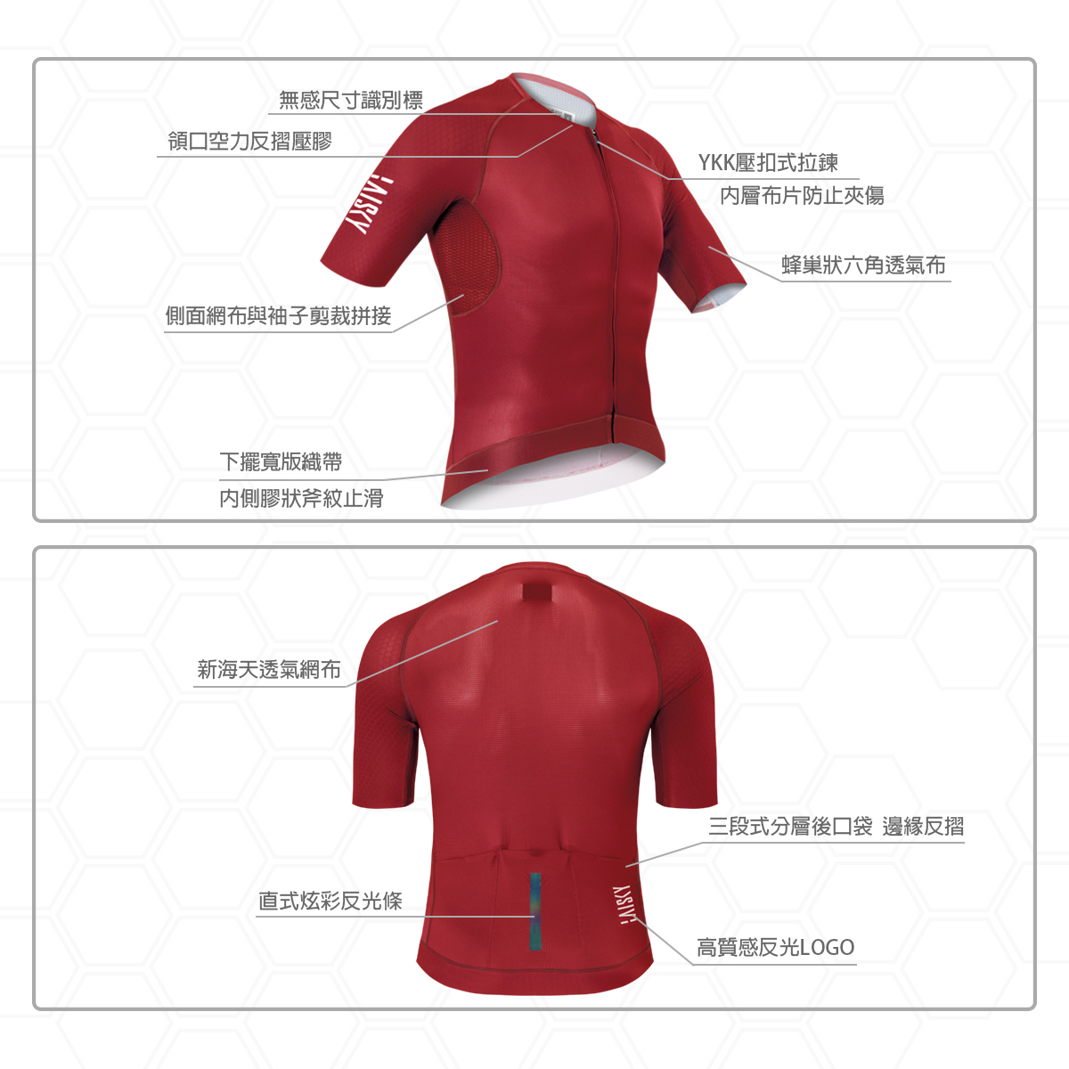 ● 袖子使用六角蜂巢梭織布,空力一體成型設計,側邊網布與袖子合身拼接