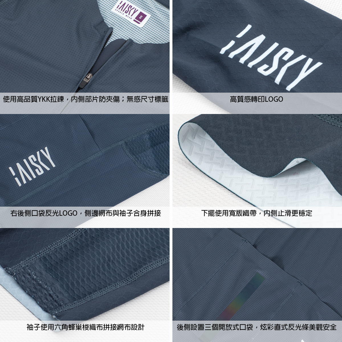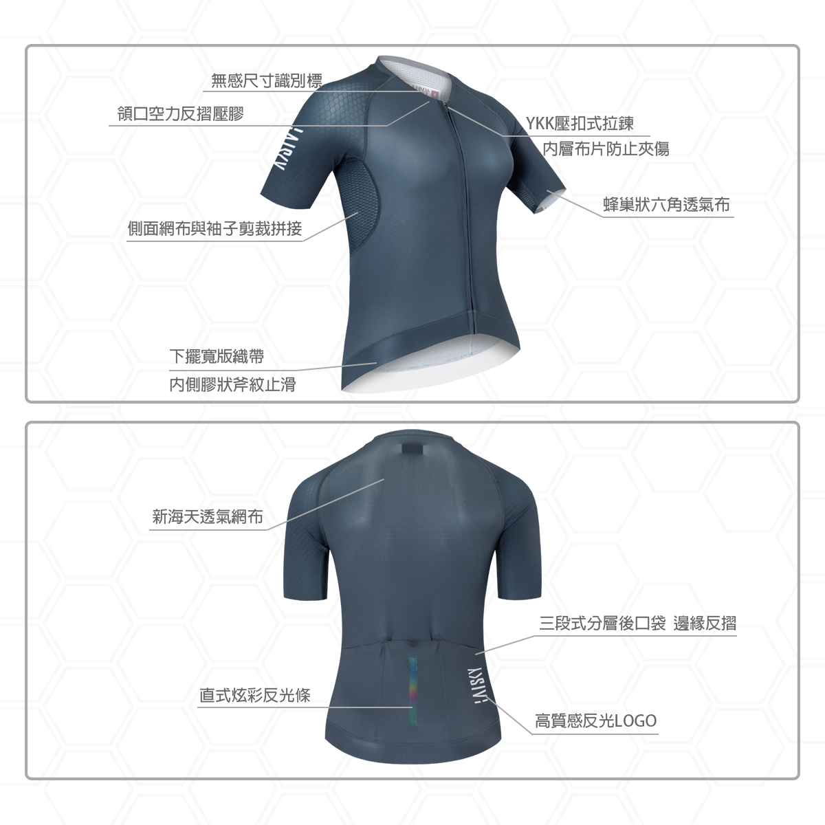 ● 袖子使用六角蜂巢梭織布,空力一體成型設計,側邊網布與袖子合身拼接