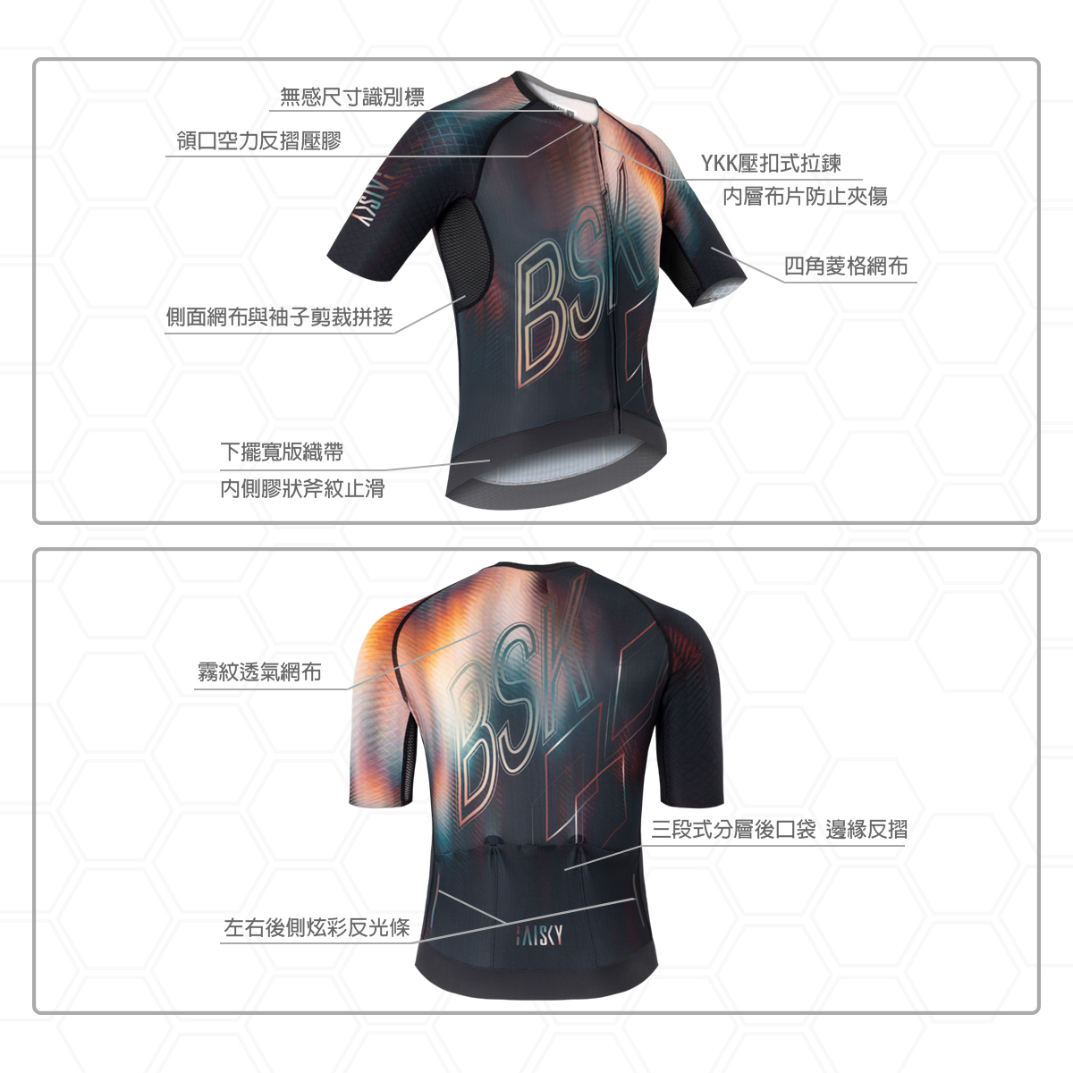 ● 袖子使用四角菱格布無縫收邊拼接透氣網布